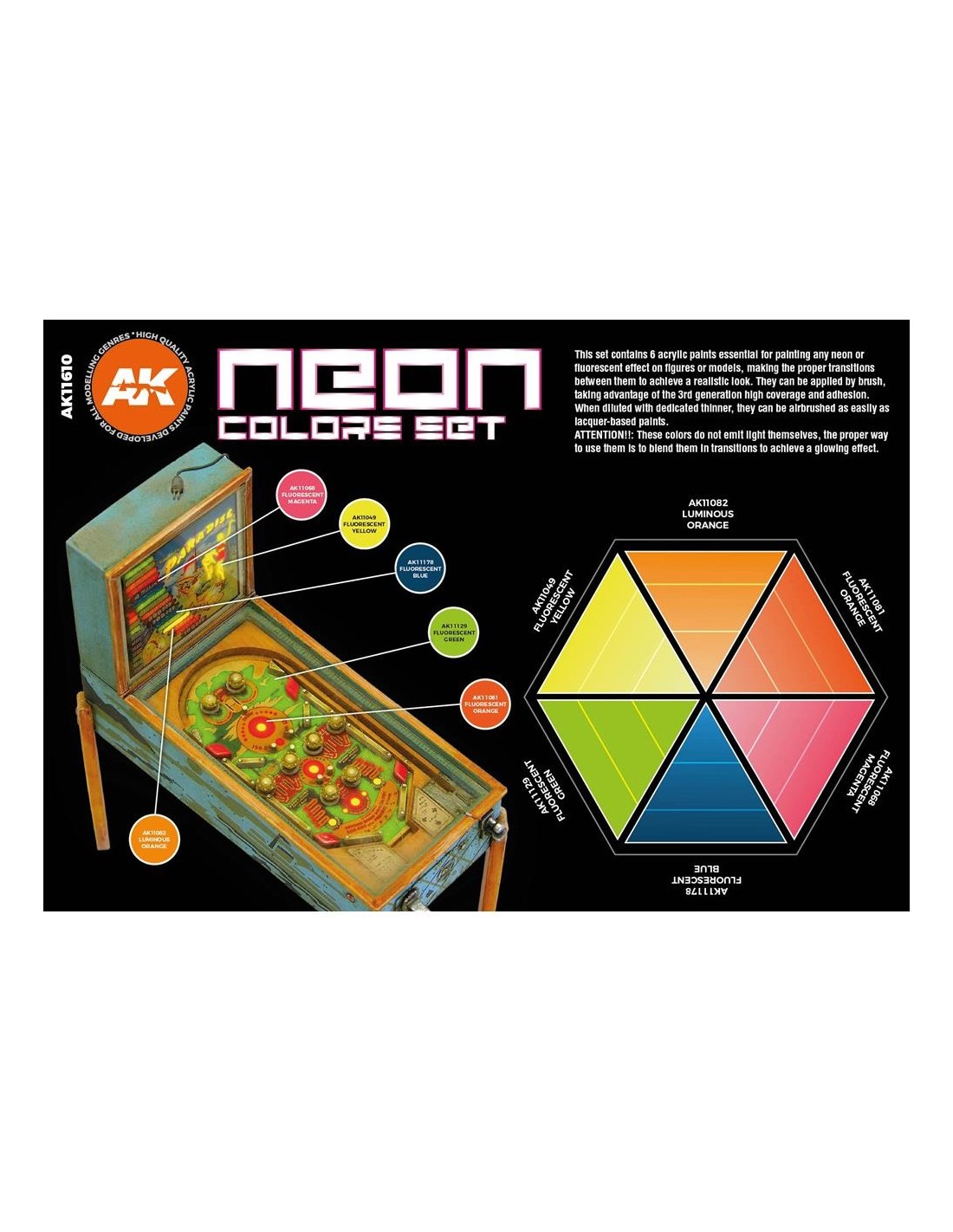 Questo set contiene 6 colori acrilici essenziali per dipingere qualsiasi effetto neon o fluorescente su figure o modelli. L'intensità dei loro pigmenti rende queste vernici molto speciali. Possono essere applicati a pennello, sfruttando l'alta copertura e l'adesione di terza generazione. Se diluiti con diluente dedicato, possono essere aerografati facilmente come le vernici a base di lacca.
