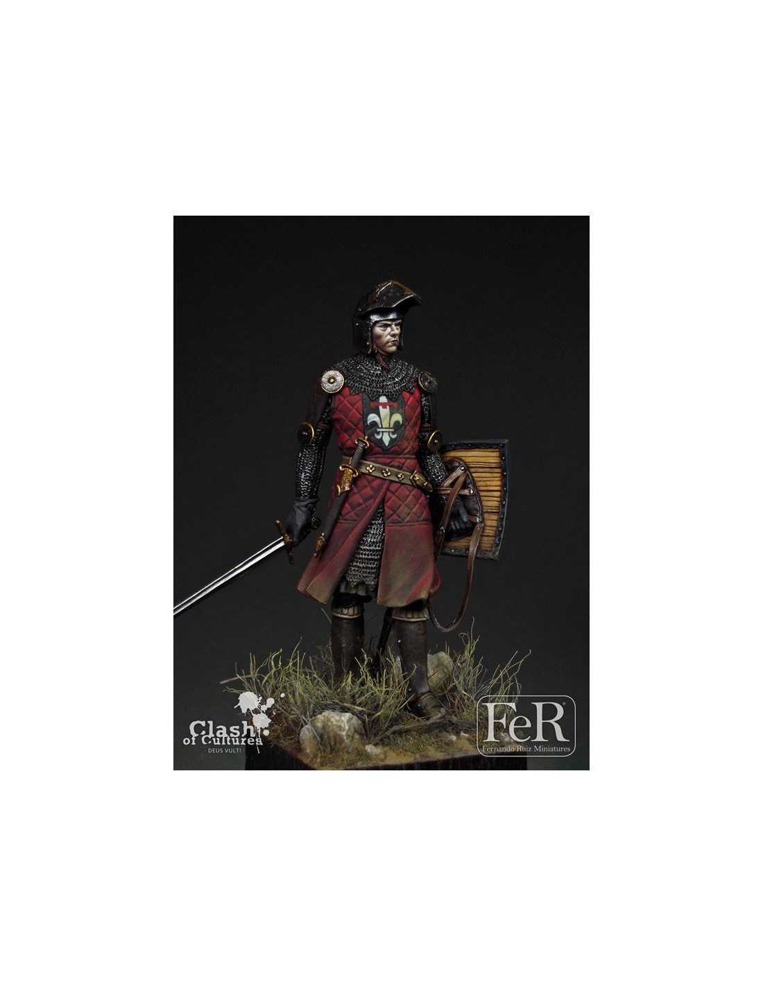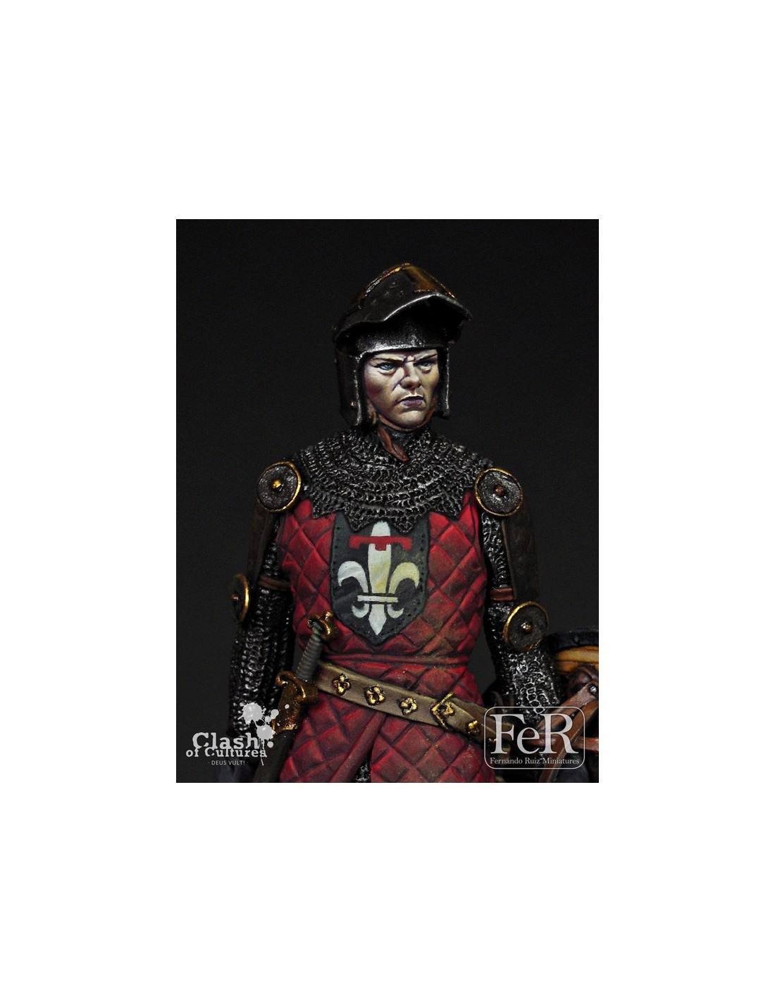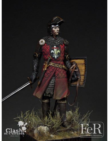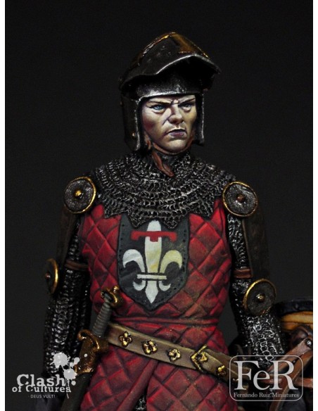 Our knight could be one of those persons, either one of those that fought for noble principles or one of those moved for more material desires. His garment is typical from early XIV century and shows the transition from protections based primarily on chainmail (omnipresent on the battlefield since several hundred years) towards a combination of chainmail, hardened leather, metallic plates or even gambesons with multiple layers of cloth. Helmets were already evolving to much more sophisticated models than the earlier ones. Heraldry was entering in its golden age and surcoats and shields were the perfect places to display it. A miniature that offers countless options of decoration for any painter.
