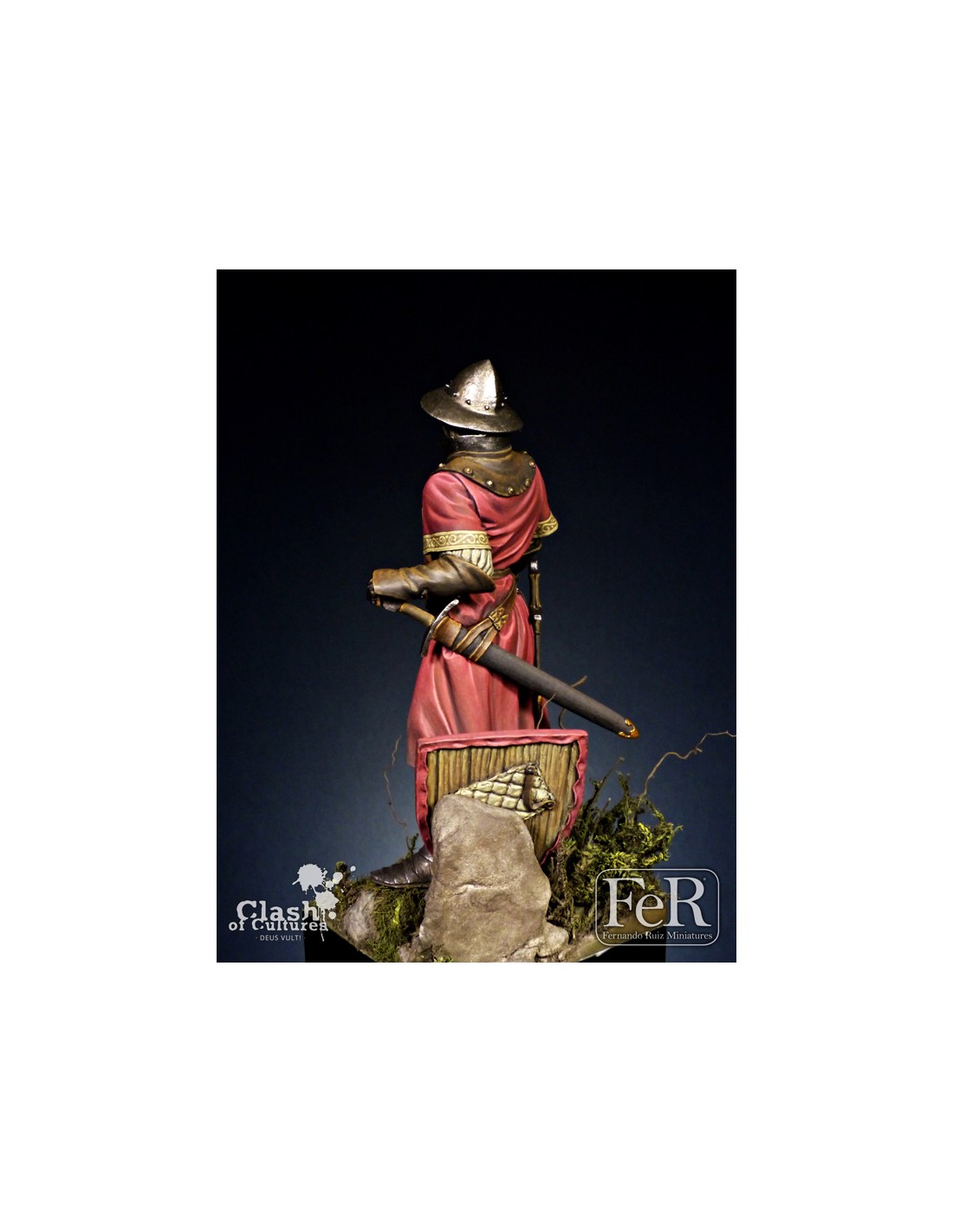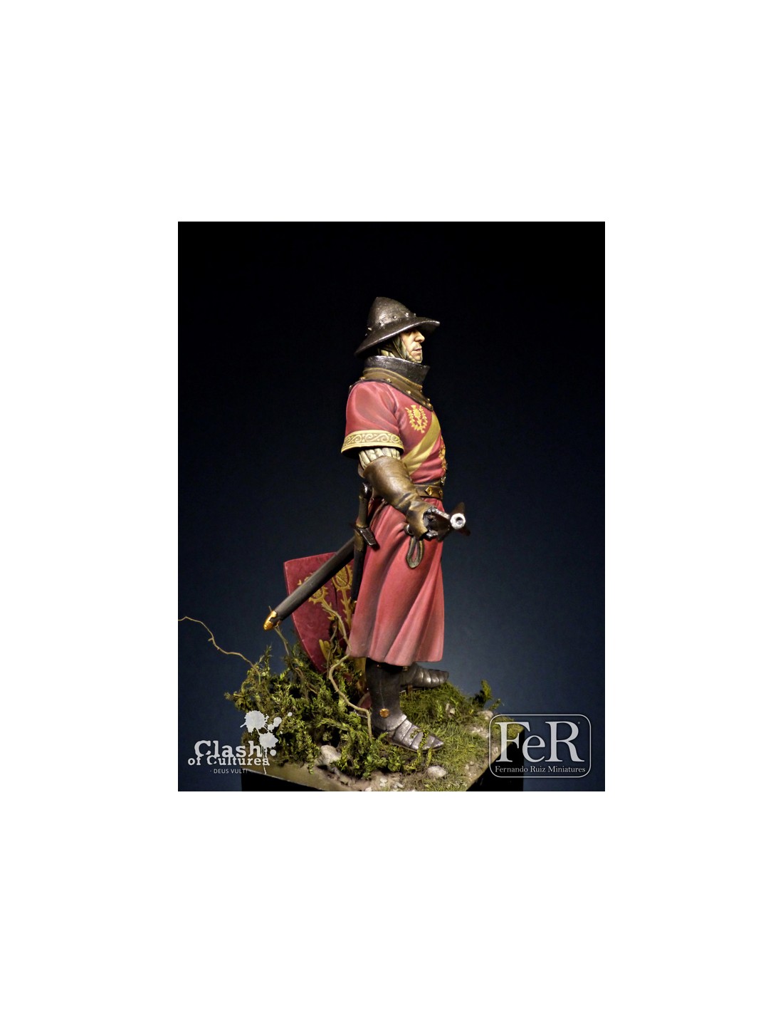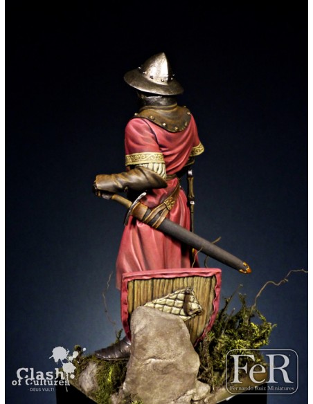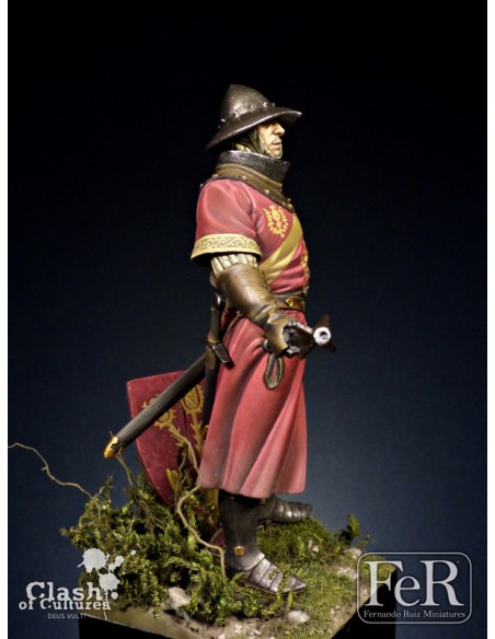 Our figure portrays a member of that noble family with typical warfare equipment of the first half of the XIV century and it is inspired on the tomb images of Ramon Folc IV of Cardona, Ramon Berenguer II and Alvar II d’Àger. It sports the coat of arms of the Cardona family but, of course, can be painted in many different ways in order to portray other contemporary subjects.