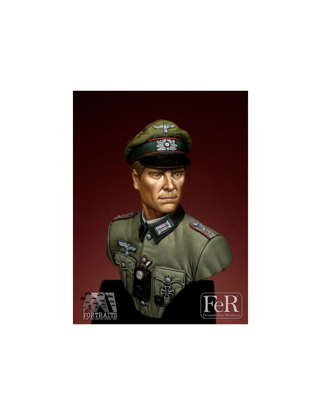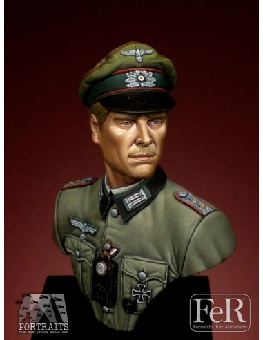 Our captain or “Hauptmann” wears an “alte art” schirmmutze, also known as “crusher cap”. In campaign, officers used to remove the inner reinforcement band of the cap to give it a more worn appearance. The M36 feldbluse is privately tailored, something usual in officers. The red piping on the cap and rank insignia indicates Artillery, but can be painted in any other branch of the army. Also, he sports a Wounded Badge, a first class Iron Cross and the ribbon of the second class Iron Cross.