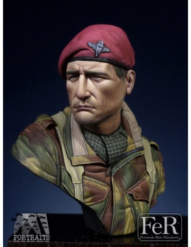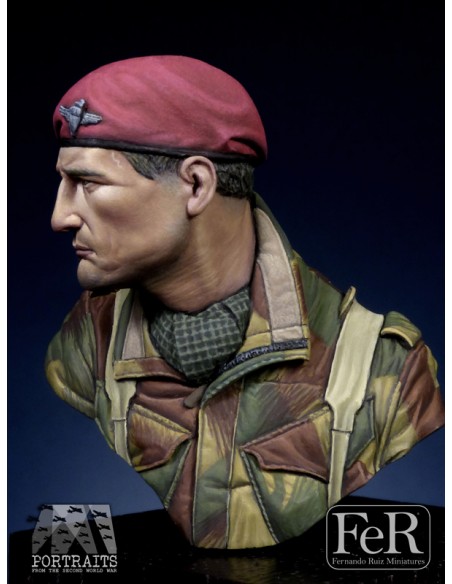 Our bust portrays one of those brave paratroopers, wearing the famous red beret that earned them the nickname of “Red Devils” and a Denison camouflage jacket.