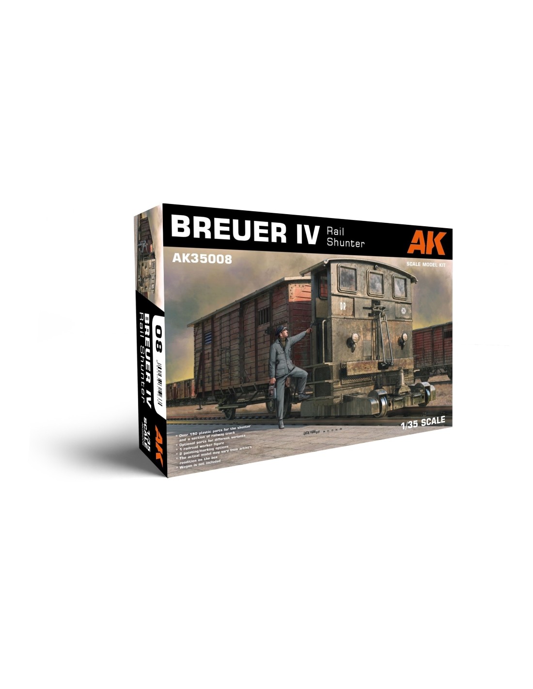 La Breuer IV fu il 4° modello di produzione della locomotiva da manovra ferroviaria leggera sviluppata dalla società tedesca H. Breuer & Co a partire dal 1913. Questa variante fu progettata negli anni '20 e si stima che circa 120 veicoli siano stati prodotti in Germania fino al 1943, con ulteriori esemplari costruiti su licenza in vari paesi europei tra cui Italia, Austria, Finlandia, Danimarca e Cecoslovacchia. Nel corso della produzione e dell'assistenza il Breuer IV ha subito diversi aggiornamenti che hanno portato infine allo sviluppo del modello V, ma sono anche motivo di differenze tra i vari esemplari conservati nei musei e catturati nelle foto di riferimento.Il kit in scala 1/35 contiene parti opzionali che permettono di rappresentare diverse modifiche viste sui veicoli reali, alcune delle quali rimasero in servizio anche fino agli anni '80. Sono inclusi anche un tratto di binario ferroviario lungo 19 cm e una figura di operaio della Reichsbahn.Le caratteristiche principali del kit:- Oltre 150 parti in plastica per la manovra e un tratto di binario ferroviario.- Parti opzionali per diverse varianti.- 1 figura di ferroviere.- 2 opzioni di verniciatura/marcatura.