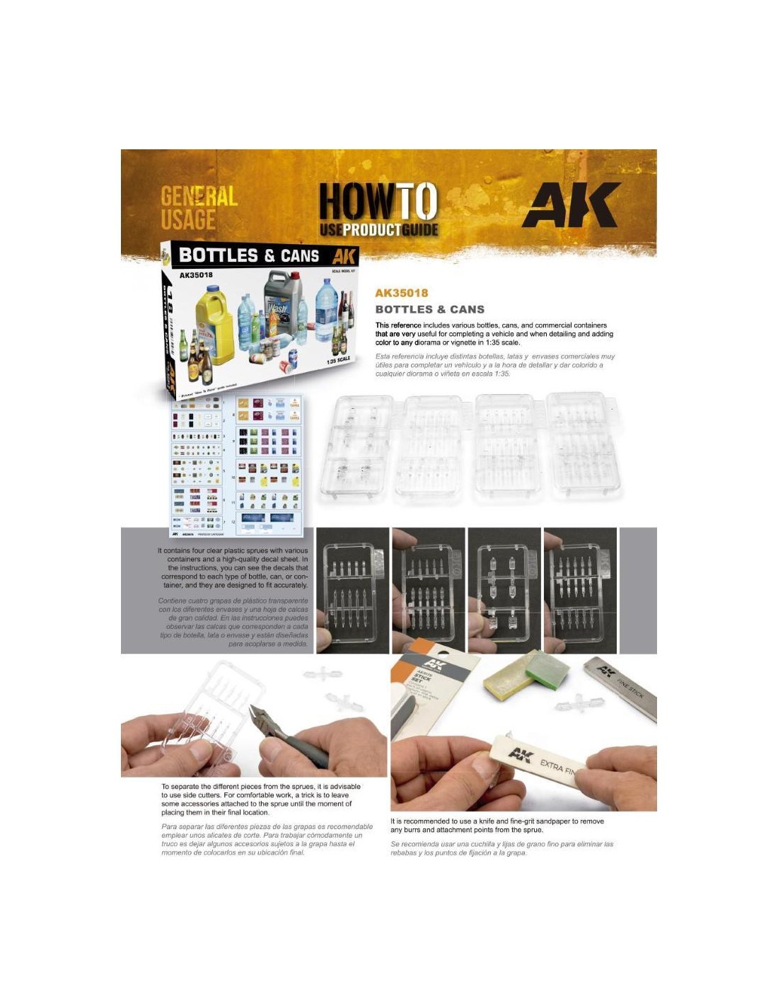 Bottiglie e lattine sono ingredienti ovvi nei diorami o nelle vignette, ma la loro aggiunta può anche ravvivare modelli non presentati su alcun tipo di base. Il nostro nuovo kit offre 11 diversi tipi di bottiglie e contenitori e 1 tipo di lattina, tutti stampati in plastica trasparente. Sono inclusi 6 pezzi per ciascuna delle bottiglie e lattine piccole e medie e 2 pezzi per ciascuno dei contenitori grandi, per un totale di 60 elementi che dovrebbero essere sufficienti per dettagliare diversi modelli o diorami. Le parti in plastica sono integrate con decalcomanie di alta qualità tra cui varie etichette stampate da Cartograf. Contiene anche una guida stampata su carta formato A5 con una guida passo passo per dipingere e decorare bottiglie, contenitori e lattine.