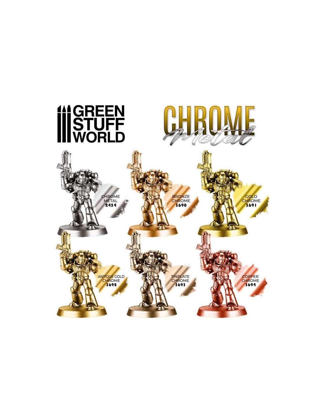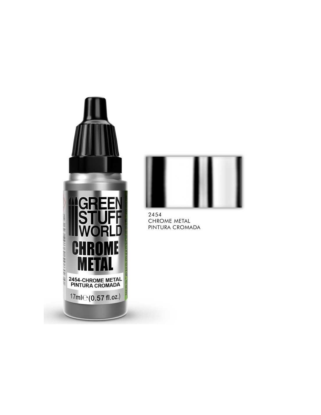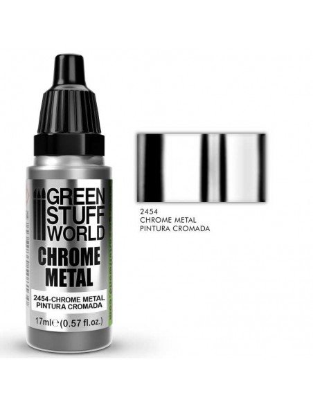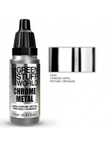 Vernice cromata è una vernice metallizzata a base di alcol che riproduce abilmente le proprietà riflettenti di una superficie cromata, come uno specchio. Pur essendo destinata principalmente all'uso con il pennello, è compatibile anche con le applicazioni ad aerografo. Dimostra una notevole versatilità, in quanto i colori cromati possono essere applicati su superfici di qualsiasi colore, e si raccomanda sempre di pulirlo con l'alcol.