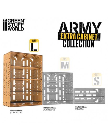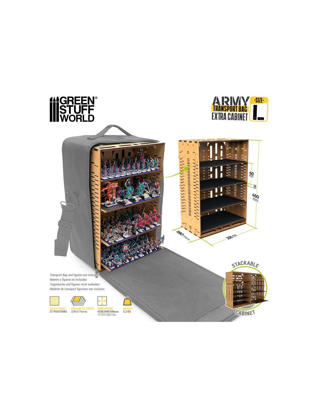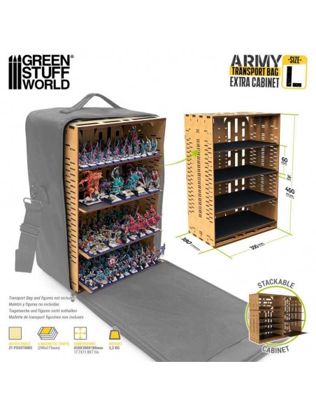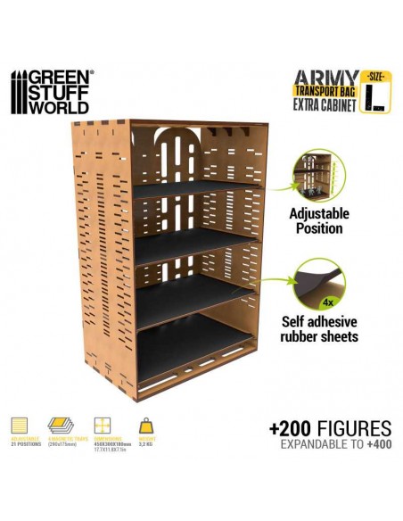 Extra Cabinet è stato progettato per completare il trasporto e lo stoccaggio delle miniature. Può essere utilizzato sia come armadio aggiuntivo per la GSW Army Transport Bag, sia come sistema di stoccaggio impilabile autonomo. Realizzato in legno MDF, è in grado di ospitare più di 200 miniature distribuite tra i suoi ripiani.