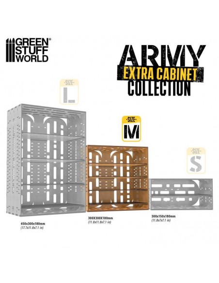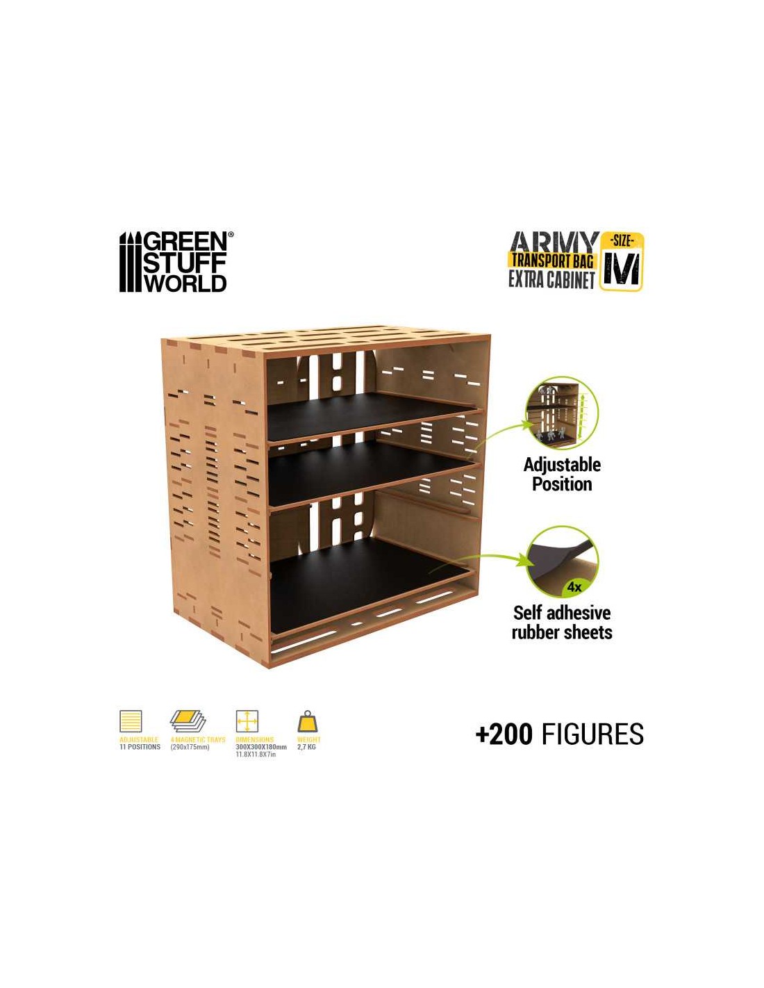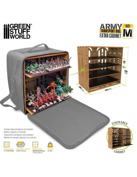 Extra Cabinet è stato progettato per completare il trasporto e lo stoccaggio delle miniature. Può essere utilizzato sia come armadio aggiuntivo per la GSW Army Transport Bag, sia come sistema di stoccaggio impilabile autonomo. Realizzato in legno MDF, è in grado di ospitare più di 200 miniature distribuite tra i suoi ripiani.