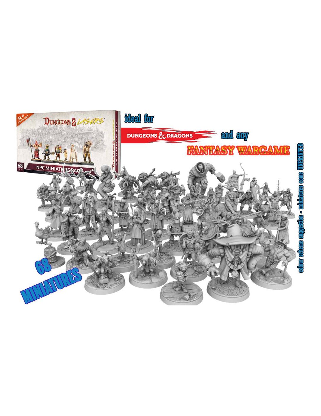 1x Ragazzo 1; 1x Ragazzo 2; 1x Ragazzo 3; 1x Roblino l' infantile; 1x Gary il pacificatore; 1x Magnus, Guerriero della Tempesta; 1x Nano minatore; 2x Kobold1; 2x Kobold 2; 1x Elfo femmina; 1x Giardiniere halfling; 1x Erborista; 1x Ostetrica; 1x Scudiero; 1x Donna delle pulizie; 1x ladra femmina; 1x Baxter; 1x Gabelliere; 1x Falconiere; 1x Prigioniero 1; 1x Prigioniero 2; 1x Guardia Reale; 1x Giullare; 1x Cacciatore; 1x Mugnaio 1; 2x Goblin 1; 2x Goblin 2; 2x Goblin 3; 1x Mercante itinerante; 1x Ladro; 1x Crociato; 1x Sterminatore di ratti; 1x Berserker; 1x Cartomante; 1x Orco femmina; 1x Cacciatrice di draghi; 1x Capitano dei pirati; 2x Non morti 1; 2x Non morti 2; 2x Non morti 3; 1x Contadino felice; 1x Taglialegna; 1x borseggiatore 1; 1x borseggiatore 2; 1x Boia; 1x Sindaco Bulbo; 1x Elfo Ranger; 1x Donna Barbaro; 1x Mago della Battaglia; 2x Gnoll 1; 2x Gnoll 2; 2x Gnoll 3; 1x Sirena delle Fogne; 1x Jinn; 1x Golem di Ferro; 1x 1x Straniero da terre lontane; 1x Cavaliere Mascherato