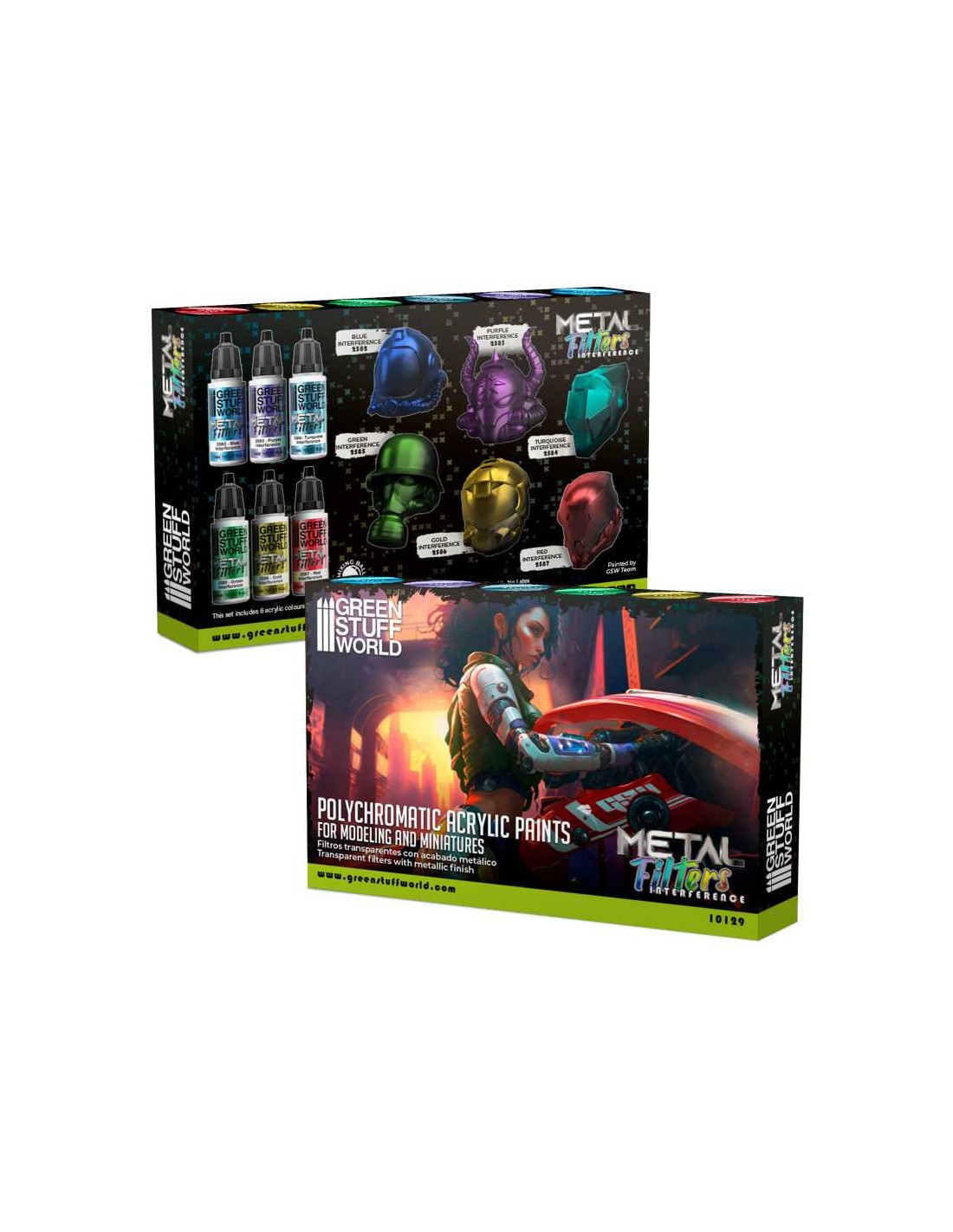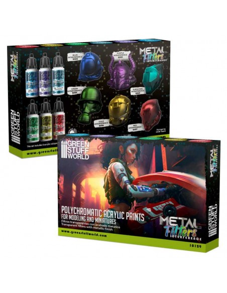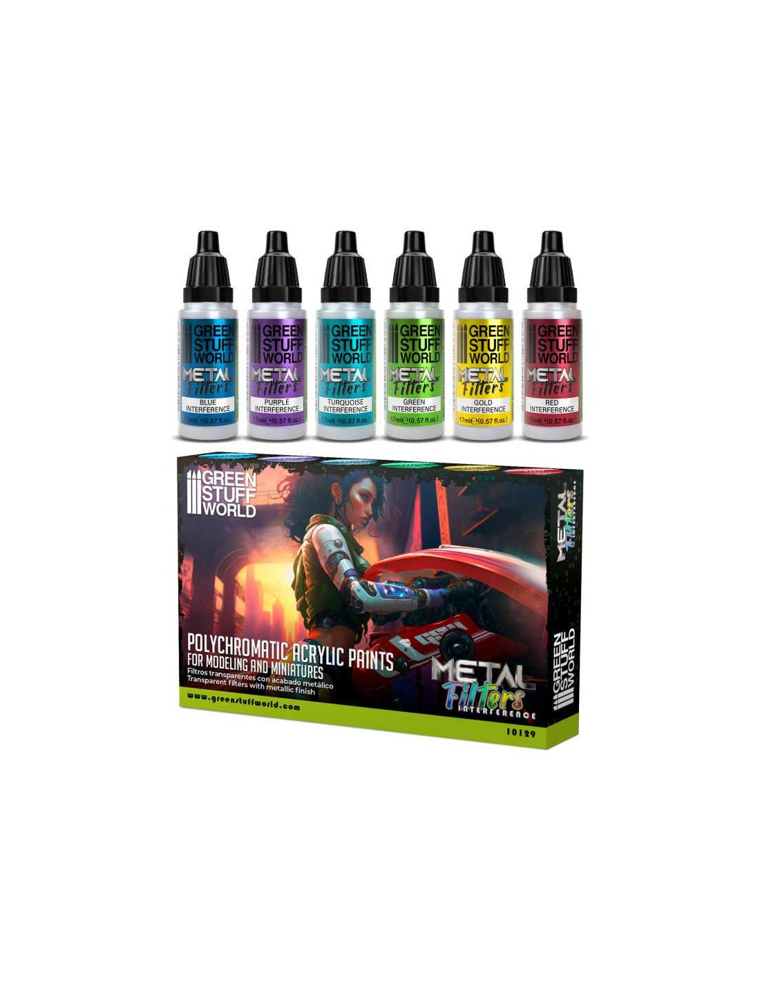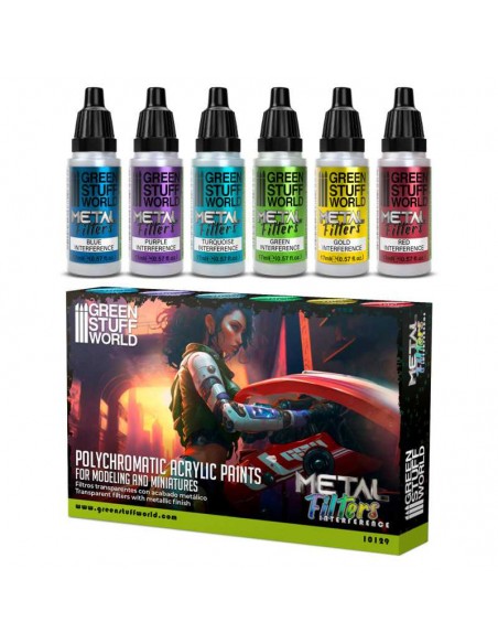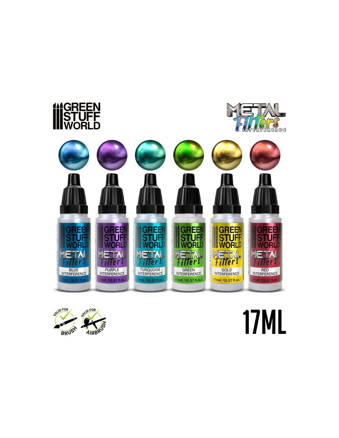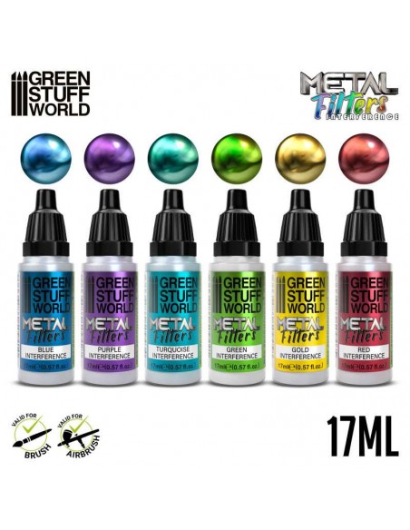 Filtri acrilici trasparenti con finitura metallica che consentono di modificare e metallizzare il colore che rivestono. Applicare su altri colori piatti, colori metallici o colori Camaleonte Colorshift. Mescolati o applicati in successione, creano nuove combinazioni. Finitura metallica lucida. Adatto per pennello e aerografo.