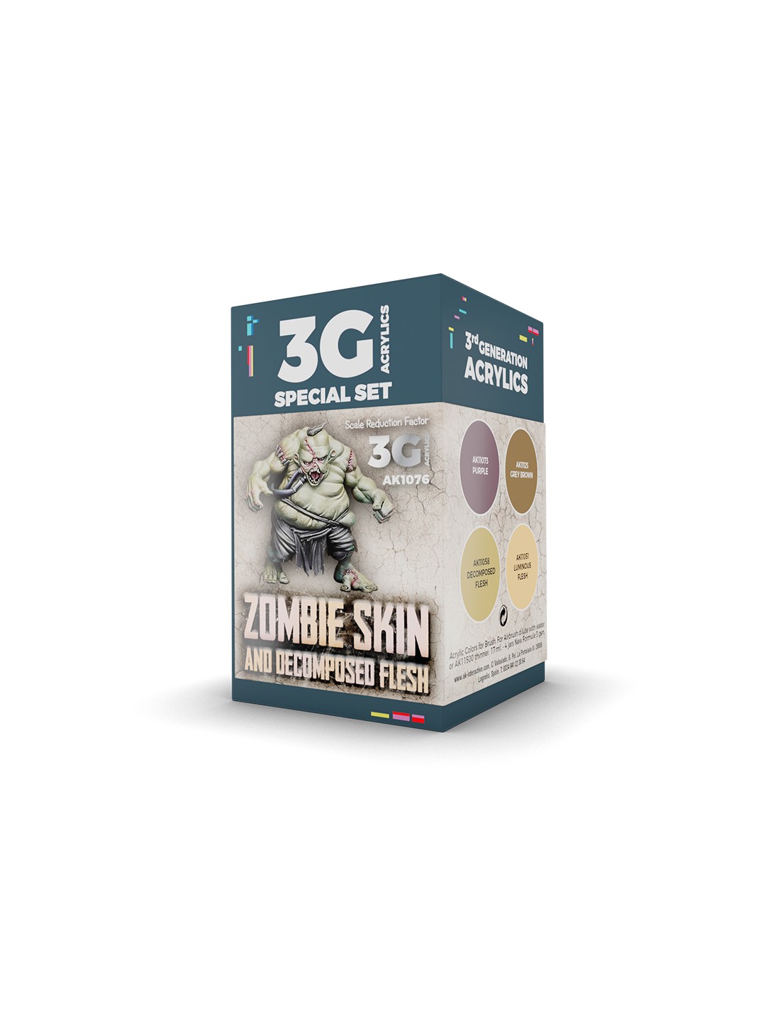 This Third Generation set contains a selection of colors to paint decomposed flesh with brush using transitions, illuminations and glazing techniques on figures. It includes 4 tones to combine easily for making different types of zombie and death flesh finishes.