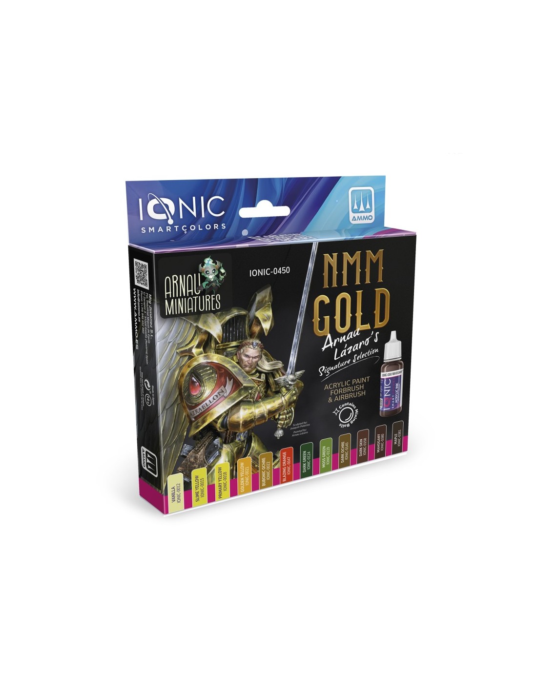 Questo set IONIC include 10 colori acrilici e 2 inchiostri, appositamente studiati per fornire i colori essenziali per dipingere metalli non metallici (NMM) dorati su miniature fantasy, fantascientifiche e storiche.