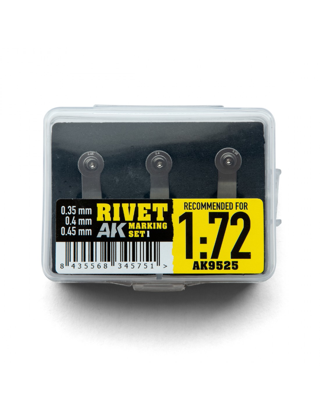 Per creare file di rivetti potete utilizzare il nastro adesivo precedentemente posizionato sul modello, un righello come guida, oppure potete farlo a mano libera lentamente. Questo set di 3 strumenti è progettato per le scale: 1/72, 1/76. Dimensioni: 0,35, 0,4 e 0,45 mm *Compatibile con steli da 6 mm, come AK9011, AK9515 o qualsiasi altra marca di utensili.
