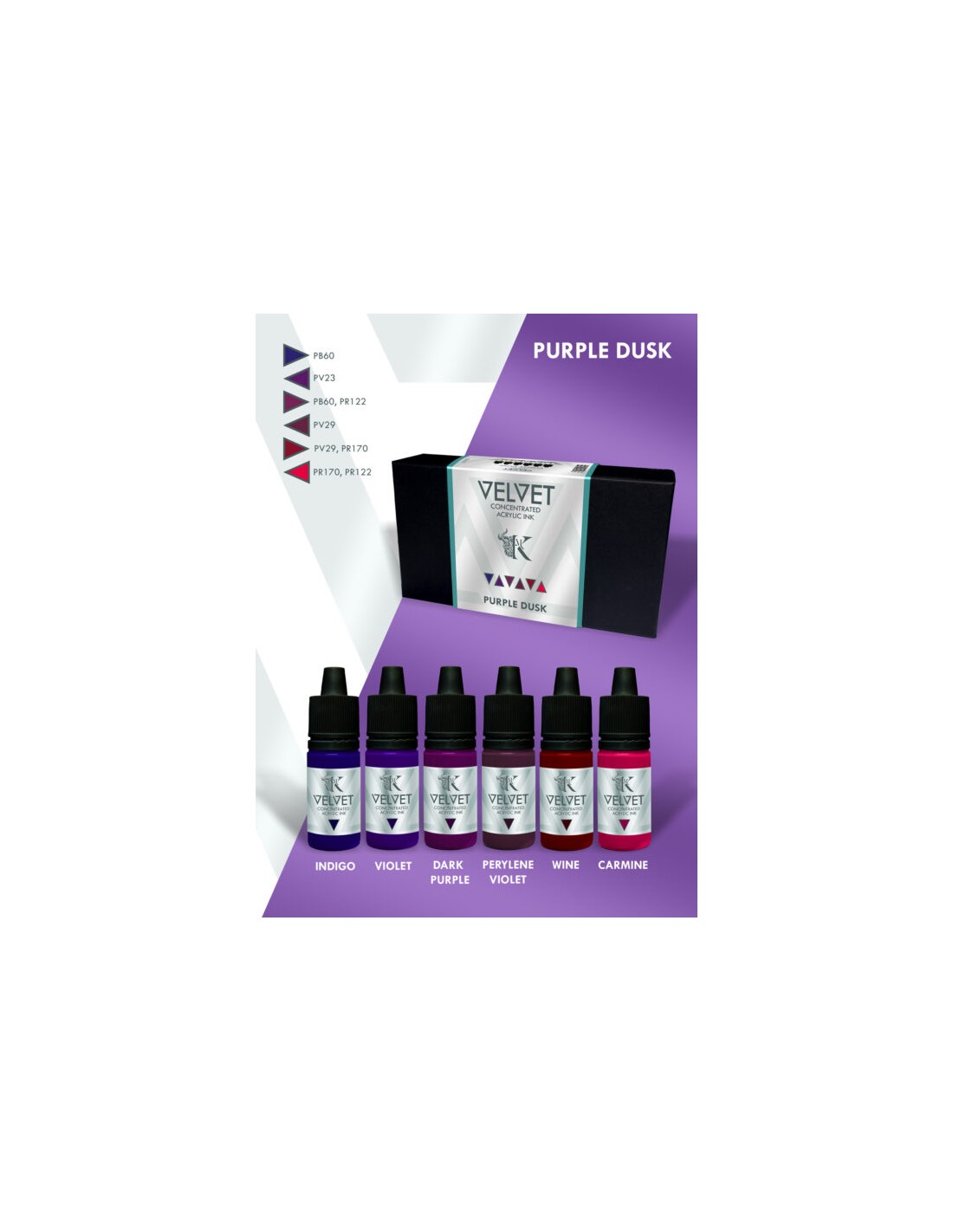 Entra in un nuovo livello di controllo ed espressione del colore con Velvet Inks Purple Dusk , un set di inchiostri acrilici concentrati e semitrasparenti, creato per ampliare il tuo modo di dipingere, mescolare e sfumare.