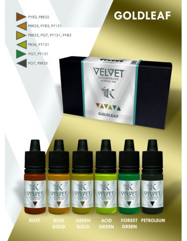 Gli inchiostri Velvet Inks Goldleaf sono formulati per essere utilizzati sia come inchiostri autonomi che come colori da sfumare per altri colori acrilici. La loro finitura satinata offre una fluidità superiore e transizioni più fluide, mantenendo al contempo una forte intensità cromatica.