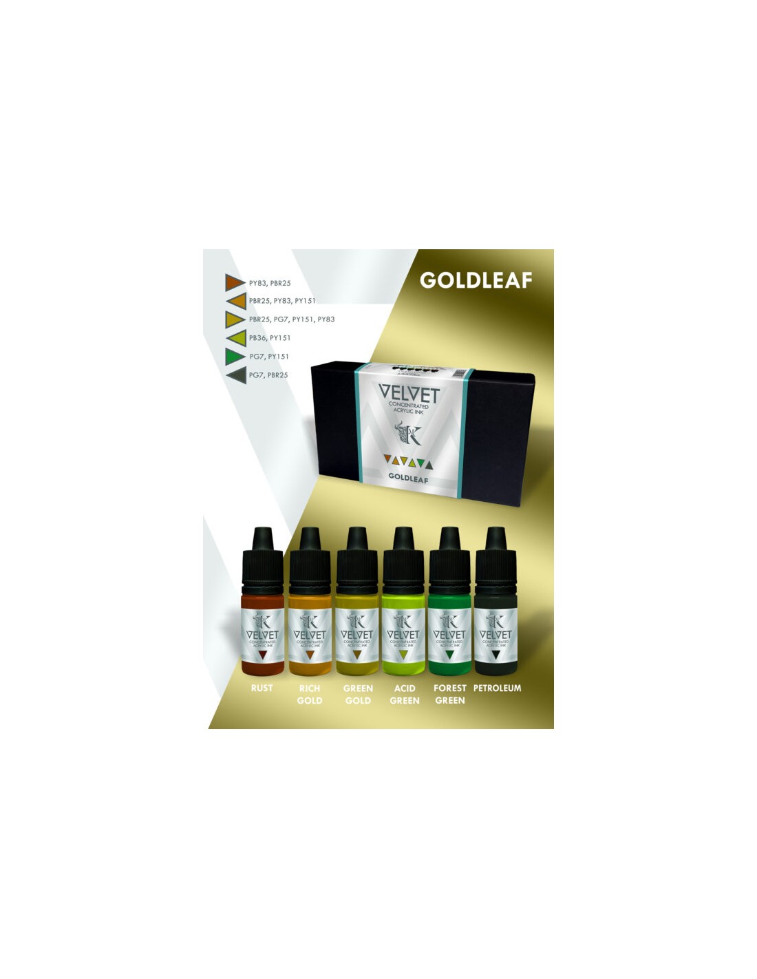Entra in un nuovo livello di controllo ed espressione del colore con Velvet Inks Goldleaf , un set di inchiostri acrilici concentrati e semitrasparenti, creato per ampliare il tuo modo di dipingere, mescolare e sfumare.