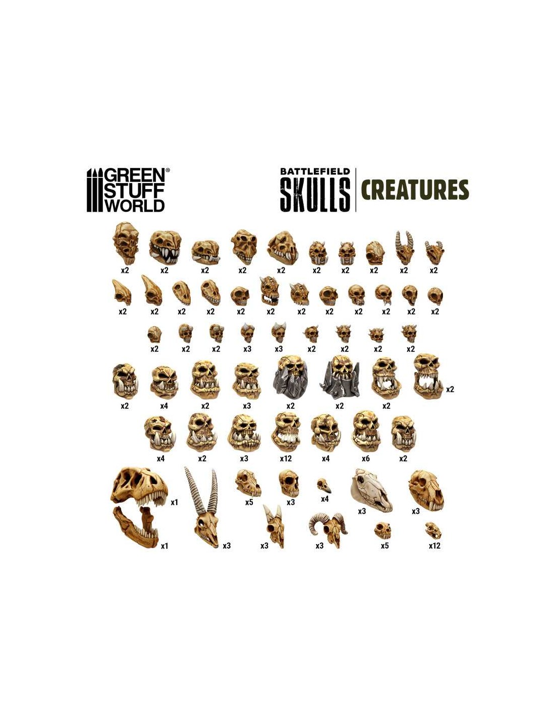 Nel nostro negozio online siamo specializzati nell'offerta di pezzi in resina di alta qualità, progettati per integrarsi perfettamente in una vasta gamma di giochi di miniature come Star Wars Shatterpoint®, Star Wars Legion®, 9th Age®, Warhammer Fantasy®, Warhammer 40k® e il rinato Warhammer Old World®. Questo pacchetto di Monster Skulls amplia le tue possibilità di personalizzazione, consentendoti di aggiungere narrativa, atmosfera e drammaticità a qualsiasi esercito o diorama.