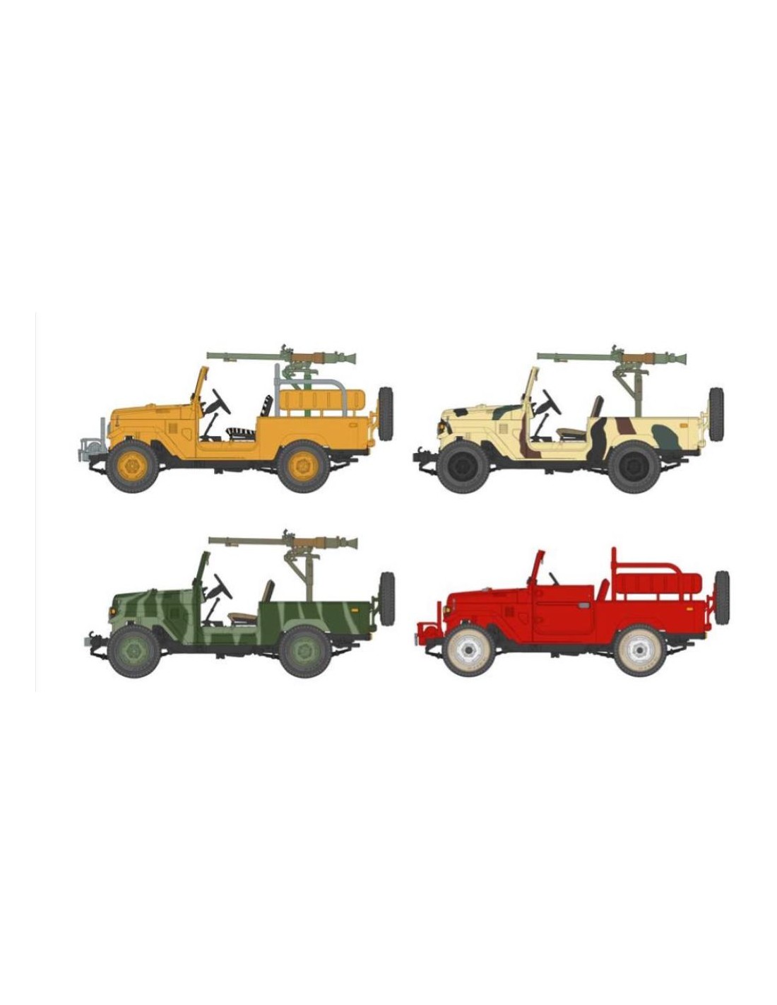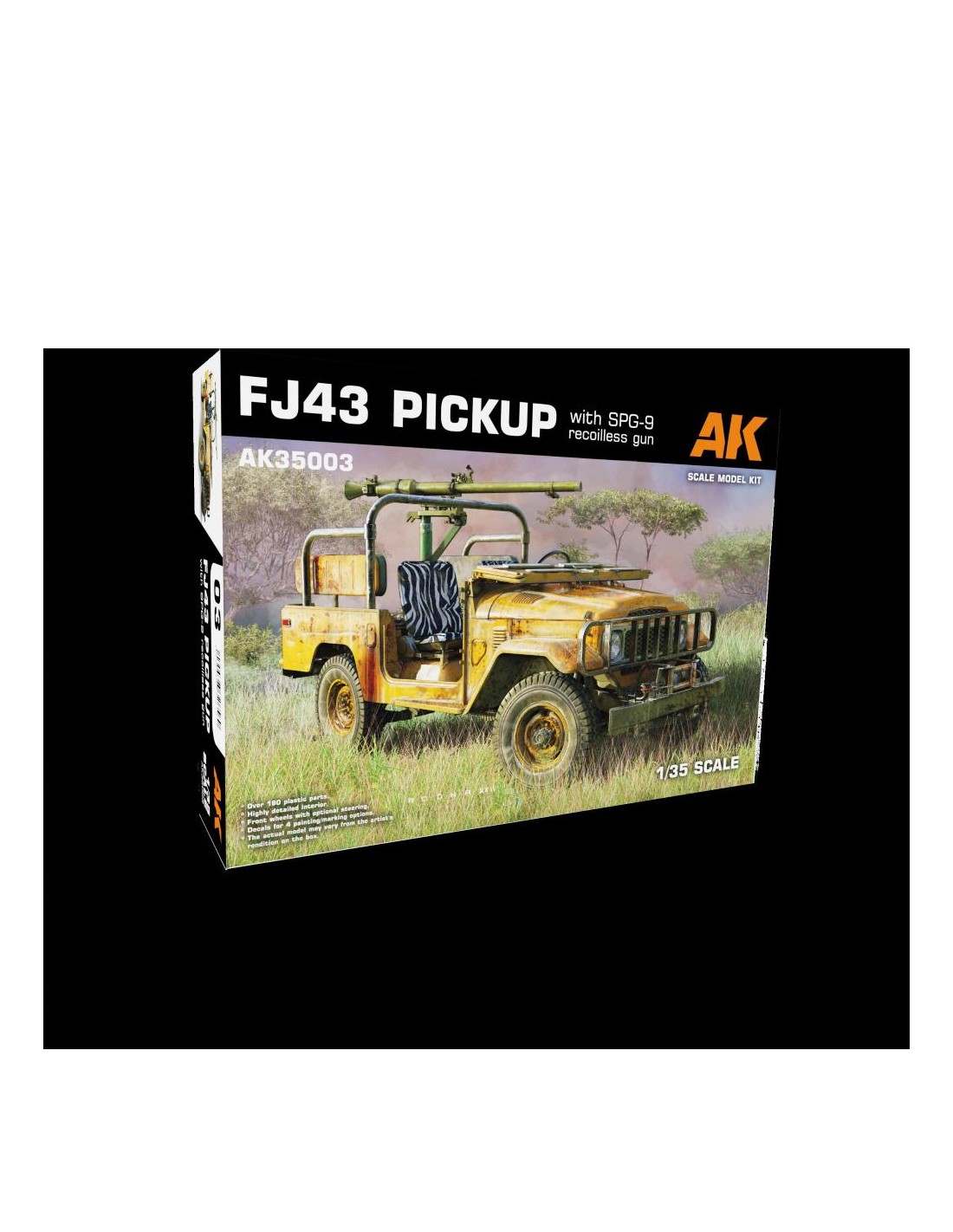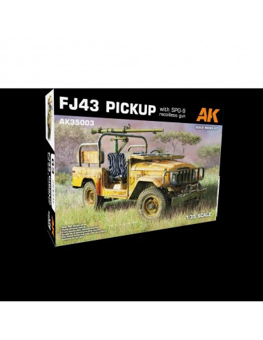 L'FJ43 fa parte della famosa serie J40 di veicoli 4x4 prodotti dalla nota azienda giapponese dal 1960. La serie J40 è stata un formidabile best seller in tutto il mondo, contribuendo a costruire la reputazione del marchio giapponese grazie alla sua robustezza, economicità e affidabilità . È stato utilizzato per decenni per compiti militari e civili e rimane ancora in servizio in molti paesi. È diventata un'icona grazie alla sua popolarità in molti conflitti, coniando anche il termine "Toyota Wars". Nel corso della produzione sono state apportate diverse modifiche e aggiornamenti ed è possibile vedere veicoli con parti diverse tra cui sedili, ruote, ecc. La designazione FJ43 si riferisce a una versione a passo medio alimentata da un motore a benzina, disponibile con capote, hard top o anche in topless. Questi veicoli sono stati anche modificati sul campo per trasportare armi diverse come mitragliatrici a canna singola e multipla, pistole senza rinculo o persino lanciarazzi. Il kit modello AK35003 rappresenta una di queste varianti "tecniche" direttamente dalla scatola, inclusa un'accurata rappresentazione del cannone senza rinculo SPG-9 sovietico che rimane un'arma di supporto al fuoco popolare sin dalla sua introduzione nel 1962. Il cannone è integrato con un adatto supporto per veicoli e proiettili di ricambio. Questa confezione contiene anche un paraurti anteriore opzionale con verricello e sedili posteriori che possono essere montati in posizione ripiegata verso l'alto o verso il basso, consentendo una moltitudine di possibilità.