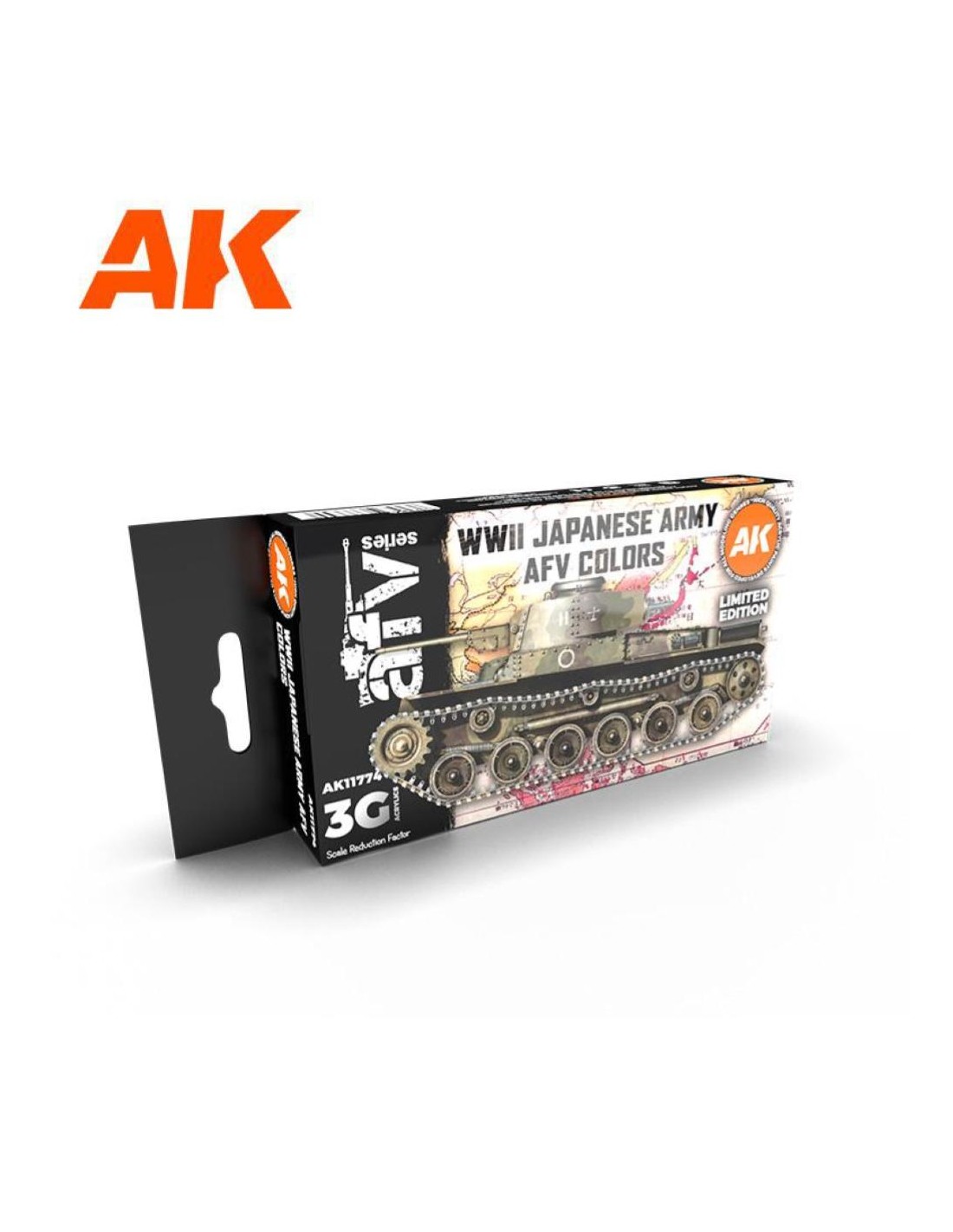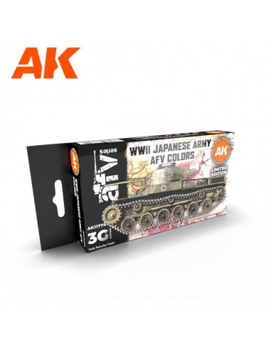 Un set di colori acrilici di terza generazione con i sei colori mimetici di base utilizzati per dipingere i veicoli dell'esercito imperiale giapponese durante la seconda guerra mondiale e i conflitti precedenti alla fine degli anni '30. Fino al 1942 erano in uso motivi mimetici multicolori costituiti da IJA Khaki (colore di base) o IJA Tea Brown (utilizzato anche come colore di base secondo alcune fonti), IJA Earth Brown e IJA Green o IJA Dry Grass. Negli anni '30, le toppe mimetiche erano inoltre bordate di linee nere. All'inizio della seconda guerra mondiale i motivi mimetici erano talvolta integrati con bande cruciformi ondulate centrate sulla parte superiore del veicolo che erano state applicate con IJA Dry Grass o un colore giallo brillante. Dal 1942 fino alla fine della guerra gli schemi di mimetizzazione consistevano solitamente in IJA Dry Grass (colore di base), IJA Earth Brown e IJA Grass Green.