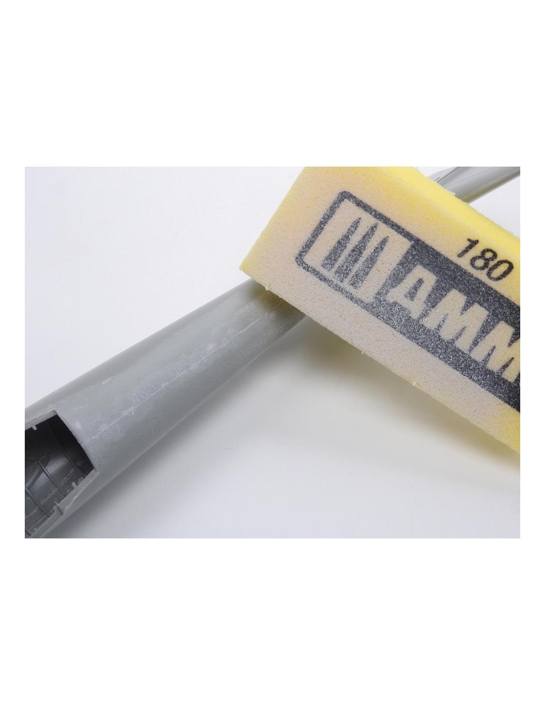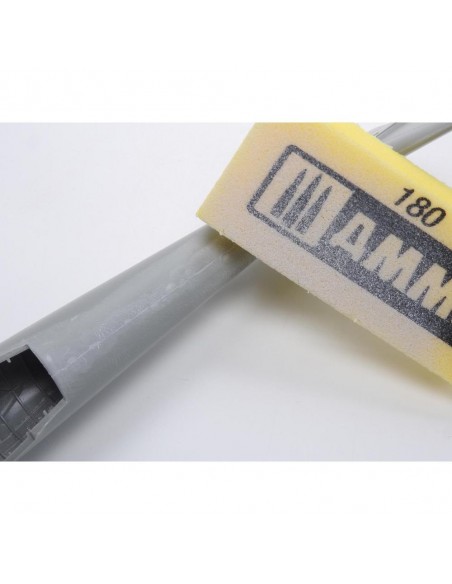Questo riferimento include quattro spugne abrasive con carta vetrata che misurano 7,5 x 3,5 cm (3 x 1,4 pollici). Un lato è a grana 100 e l'altro a grana 180. Il corpo in schiuma è un po' più rigido del solito per poter lavorare su zone difficili da raggiungere o per carteggiare una grande quantità di materiale. Questa spugna abrasiva può essere utilizzata su tutti i tipi di materiali: resina, metallo, legno e, naturalmente, plastica. Sarà anche particolarmente utile per rimuovere ogni traccia di colla o stucco rimasta dopo aver riempito le fessure e le giunture, soprattutto quelle che si trovano nelle zone lisce. Può essere utilizzato sia asciutta che inumidita con acqua. Si consiglia di tagliare un pezzo della dimensione richiesta per il lavoro in modo da evitare sprechi. Il retro ha la granulometria stampata su tutta la superficie in modo che una volta tagliato un pezzo sia ancora facilmente identificabile. Ideale per l'uso in combinazione con diverse granulometrie e altri strumenti di levigatura